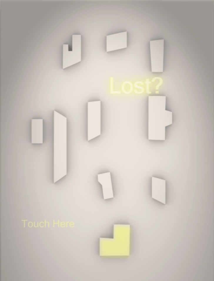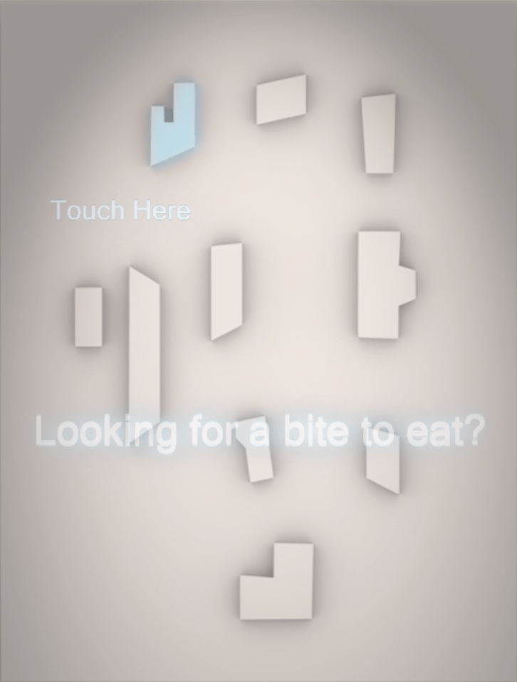 By highlighting buildings with a glow effect and displaying a ‘Touch Here’ feature, the map is inviting users to interact instantly. The accompanying phrases like ‘Lost?’ or ‘Looking for a bite to eat?’ inform users that the map can provide help and that it is indeed a campus map that can display directions! The glow effect used in a few of the animations for our video enhances the idea that the colours are being projected onto the surface.